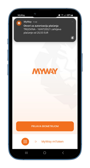Da biste proveli ovaj način potvrdite online kupnje, ako ste korisnik iOS uređaja ili na uređaju imate Android 13 (ili viši) operativni sustav, prilikom prvog pokretanja aplikacije, prije procesa registracije, prihvatite opciju primanja "Obavijesti" (push poruka). Ako na uređaju imate Android operativni sustav manji od 13, u postavkama mobilnog telefona automatski je uključena opcija primanja „Obavijesti" za MyWay mobilnu aplikaciju. Ako u 90 sekundi od pojave push poruke ne obavite potvrdu plaćanja, bit će Vam ponuđena autentifikacija uz MyWay mToken i skeniranje QR koda.