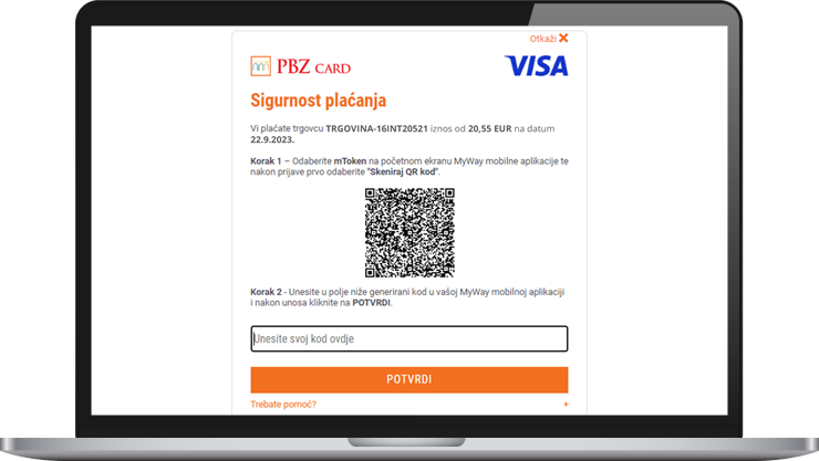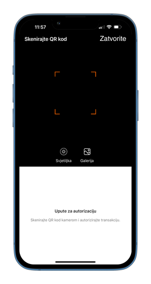 • QR koda kada niste primili push poruku, na primljenu push poruku niste pravovremeno reagirali ili ste na PBZ Cardovoj stranici za autentifikaciju odabrali opciju „Odaberite drugi način provjere autentičnosti“