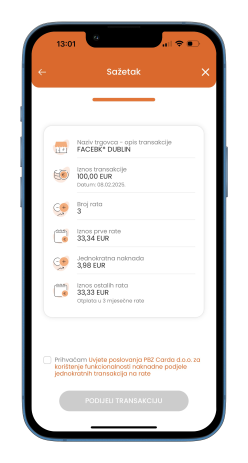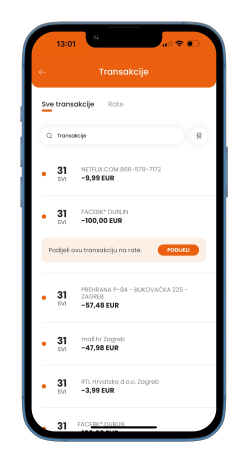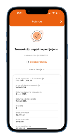 Napomena: Podjela na rate jednokratnih transakcija na prodajnom mjestu izvan Hrvatske nije dostupna za Premium Visa Revolving, Visa Croatia Airlines revolving, Visa Student i Premium Visa Prepaid kartice te kartice iz nagradnih igara.